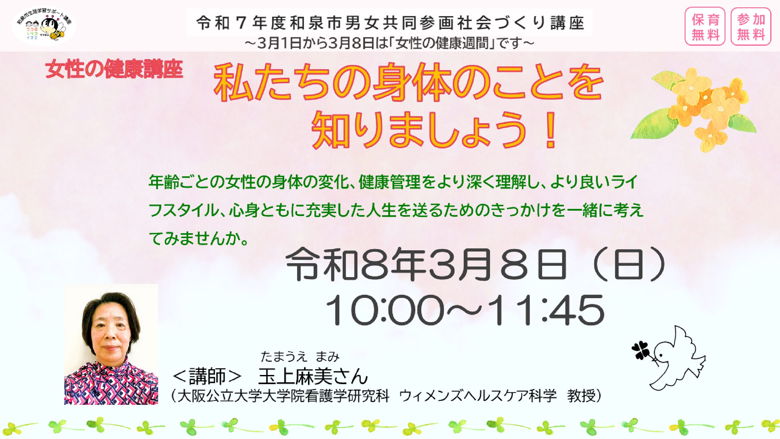 | 講師 | 玉上 麻美さん(大阪公立大学大学院看護学研究科ウィメンズヘルスケア科学教授) |